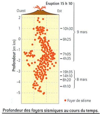 Entre le 8 et le 9 mars 1998, 2300 séismes ont été enregistrés sur le piton de la Fournaise. Le 9 mars, à 15 h 10, la lave s'écoule par sept fissures formées sur la pente nord du volcan. »