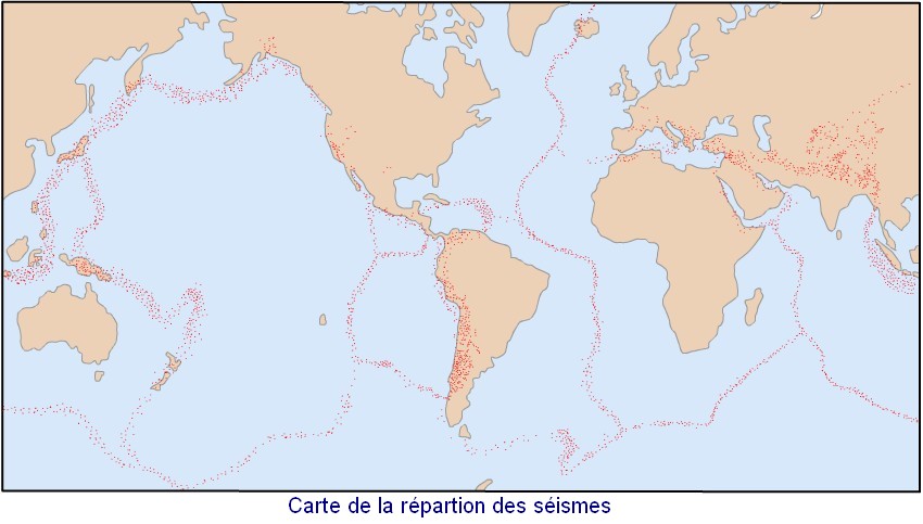 Survole l'image pour comparer la répartition de séismes et des volcans