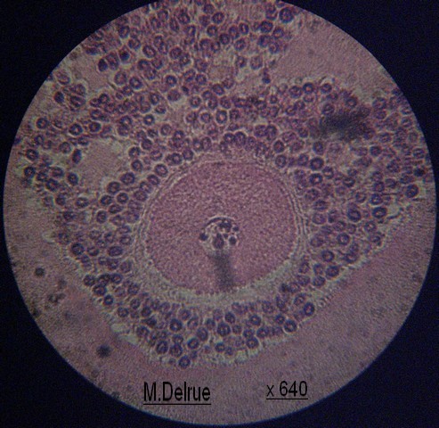 Coupe d'ovaire à fort grossissement On distingue l'ovule entouré de nombreuses cellules folliculaires L'ovule contient un noyau |