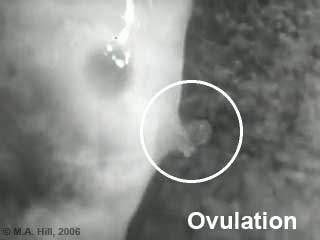 Dans le cercle, l'ovule en train d'être expulsé de l'ovaire. L'ovulation a lieu au 14ème jour pour un cycle de 28 jours