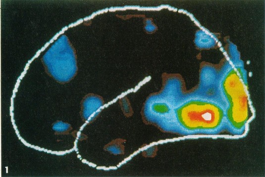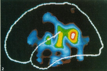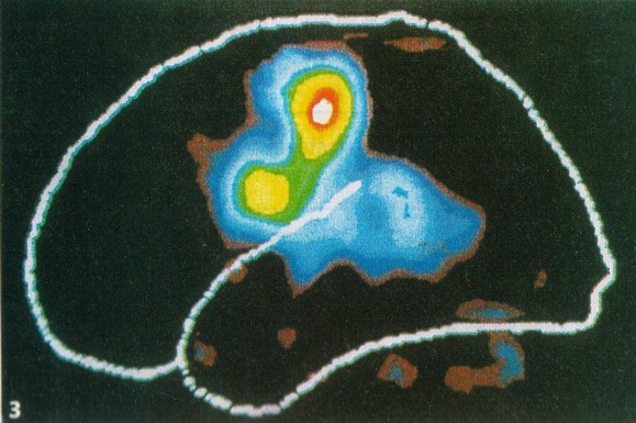 Les zones en couleur(blanc,rouge,jaune,vert) traduisent une augmentation de l'activité du cerveau