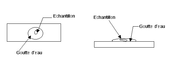 1. Prendre une lame de verre, effacer les traces qu'il peut y avoir dessus. 2. Prélever, à l'aide d'un instrument (pince fine, aiguille lancéolée, scalpel…), une petite quantité de matériel à observer (c'est l'échantillon). Cet échantillon doit être le plus petit et le plus fin possible. 3. Mettre l'échantillon sur la lame et étaler-le au maximum (moins d'épaisseur possible). 4. Placer une goutte d'eau sur l'échantillon en trempant le doigt dans l'eau et en laissant tomber la goutte. |