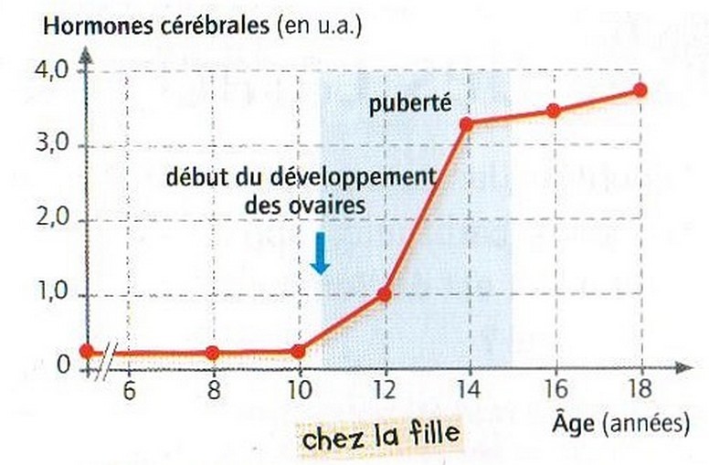Evolution de la quantité d'hormones cérébrales chez la fille ( u.a : unité arbitraire , c'est un unité qui n'informe pas sur les quantités réelles mais sur les quantités relatives )