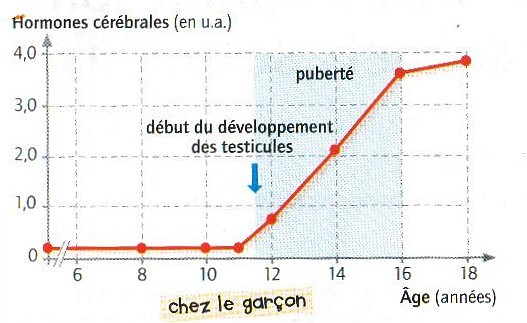 Evolution de la quantité d'hormones cérébrales chez le garçon ( u.a : unité arbitraire , c'est un unité qui n'informe pas sur les quantités réelles mais sur les quantités relatives )